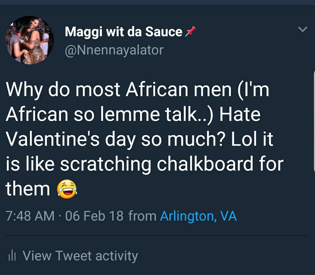 Now, some men did respond and gave me answers like ‘it is a forced holiday’ or ‘the actually holiday should not be celebrated or a holiday at all’, etc, but then should all holidays be treated like this? Unless you are a practicing Witness, I wonder why the push back from this one holiday? If you are in a serious relationship with someone that loves Valentine’s Day, should you break up? These are questions that need answers!